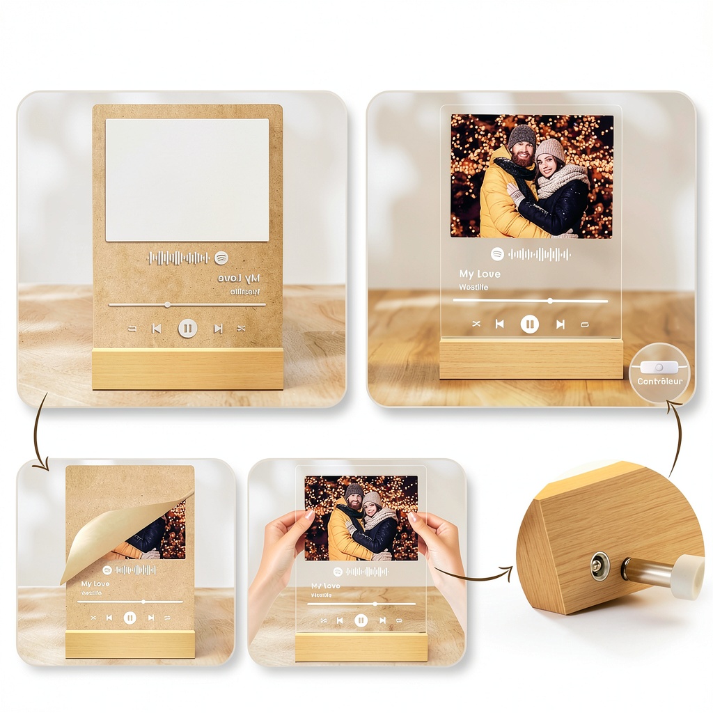 Il suffit de fournir une photo numérique et le texte souhaité lors de la commande. Notre équipe imprime en haute définition sur le cadre acrylique, avec un processus simple via notre site ou service client.